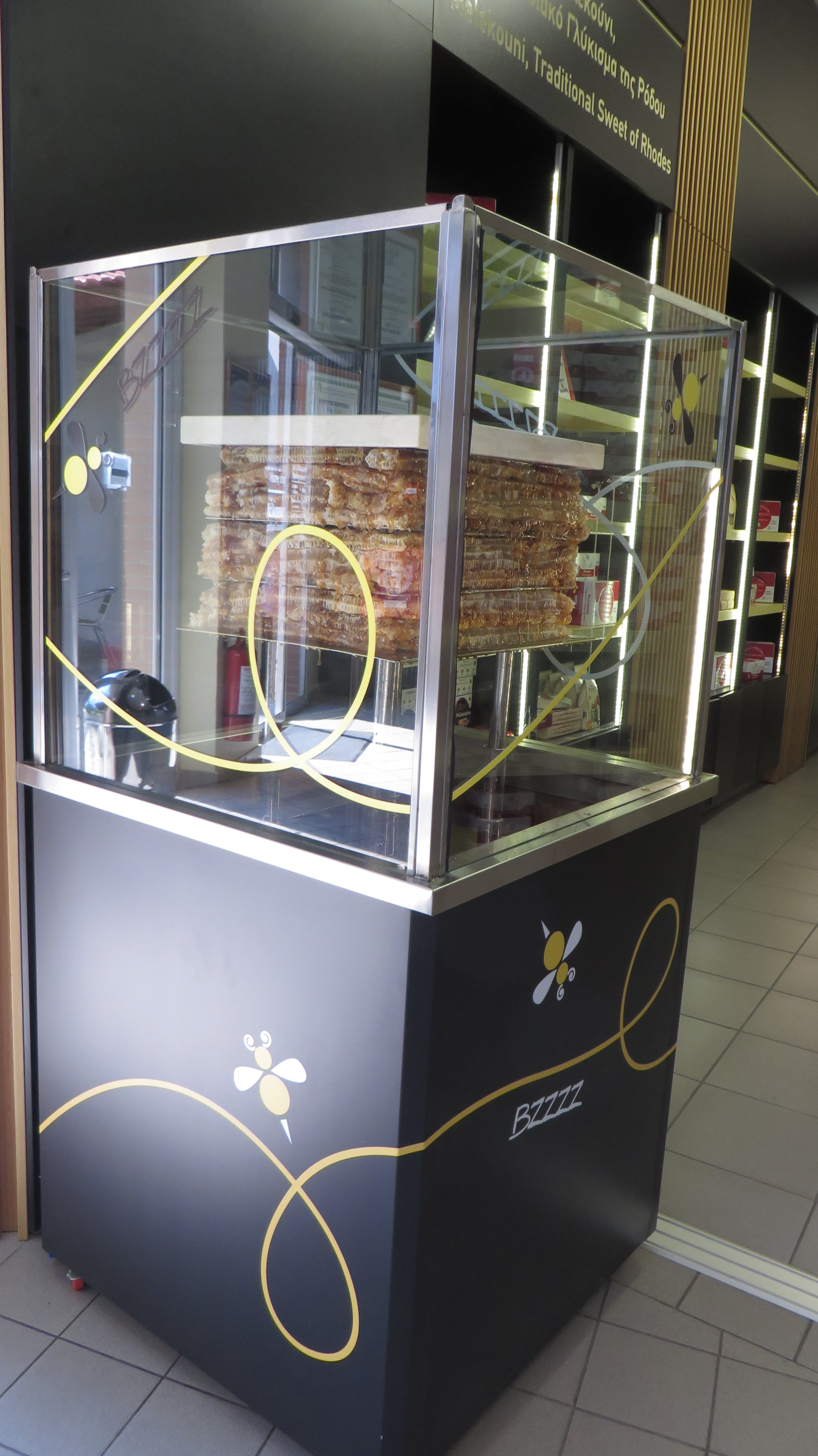 Absolutely, when it comes to selling, Greeks are The Experts! Honey and everything else, royal jelly, propolis, pollen, wax figures, T-shirts, caps, plates…